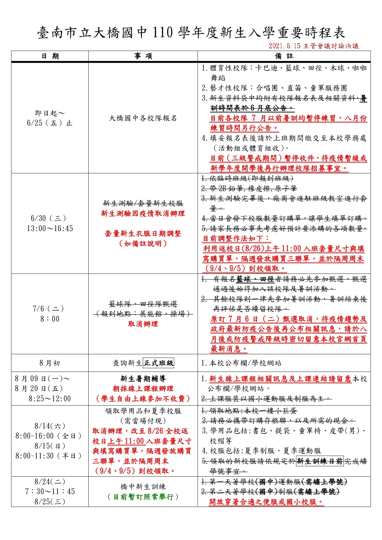 因新冠肺炎疫情嚴重,目前仍為三級警戒,本校針對新學年度新生時程規劃有所修正,請 110 學年度新生家長詳細閱讀, 如有問題,請電洽 06-3021793 分機 13 、 17 、 23 學務處,或洽 12 、 22 、 29 教務處、謝謝!