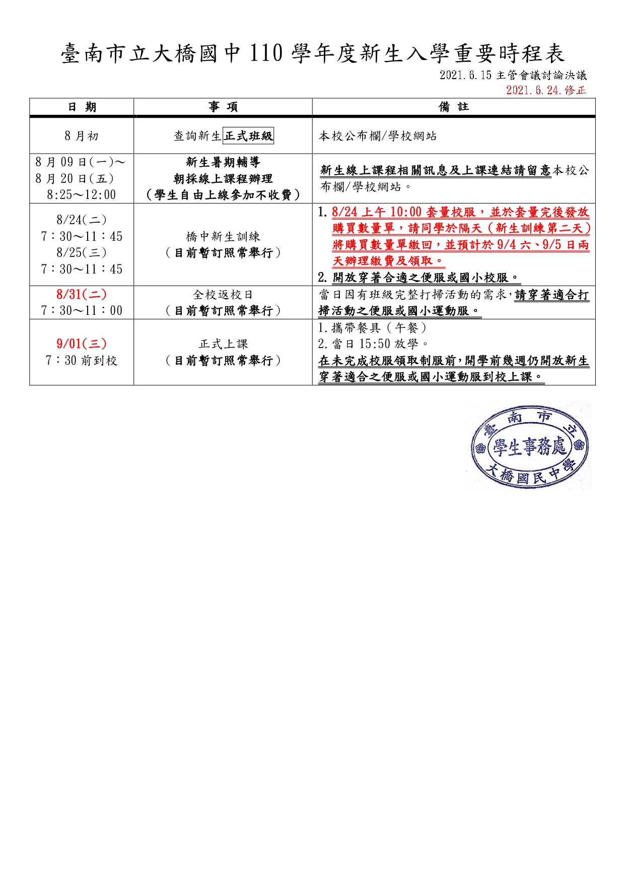 主要調整的部分是返校日延至開學前一天 8/31 、套量衣服改至新生訓練第一天辦理,餘請詳閱附件。